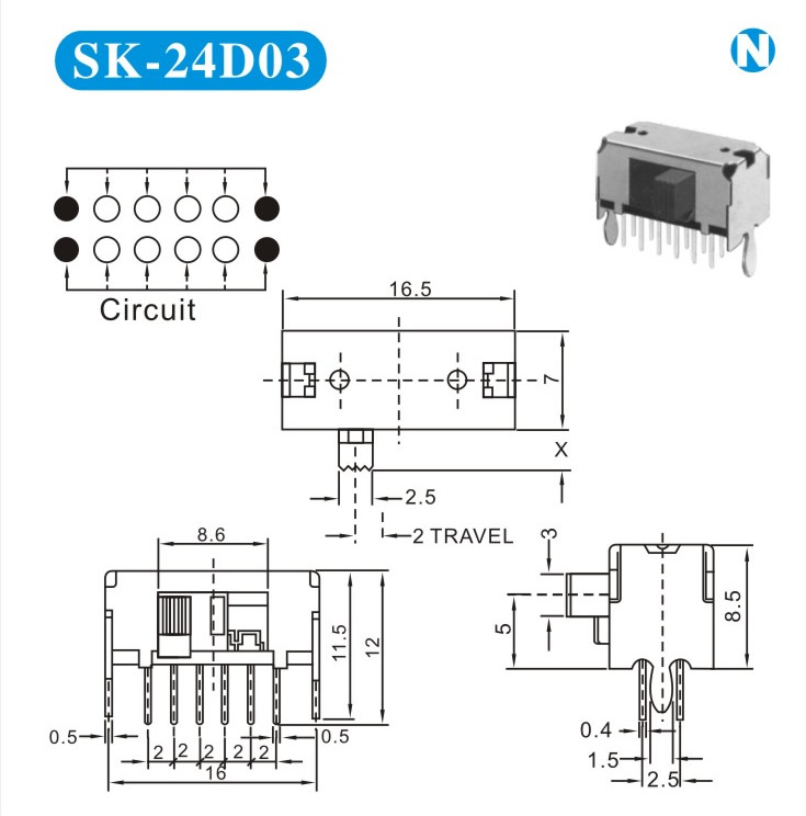 SK-24D03 詳細資料 產(chǎn)品說明: 技術(shù)指標: 使用溫度范圍 -20~+70℃ 耐壓 AC250V(50Hz)/min 額定負荷 DC 50V 0.5A 動作力 250±100gf 接觸電阻 ≤0.05Ω 機械壽命 10000次 絕緣電阻 ≥100MΩ
