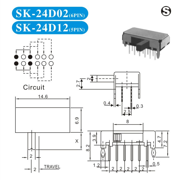 SK-24D02 詳細(xì)資料 產(chǎn)品說明: 技術(shù)指標(biāo): 使用溫度范圍 -20~+70℃ 耐壓 AC250V(50Hz)/min 額定負(fù)荷 DC 50V 0.5A 動作力 250±100gf 接觸電阻 ≤0.05Ω 機(jī)械壽命 10000次 絕緣電阻 ≥100MΩ