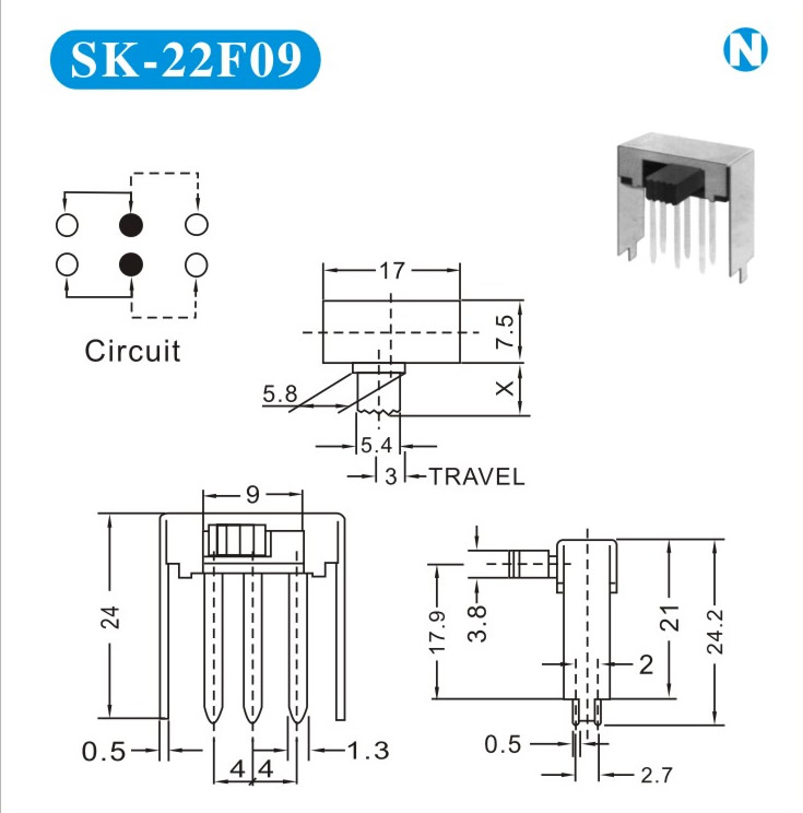 SK-22F09 詳細資料 產(chǎn)品說明: 技術指標: 使用溫度范圍 -20~+70℃ 耐壓 AC250V(50Hz)/min 額定負荷 DC 50V 0.5A 動作力 250±100gf 接觸電阻 ≤0.05Ω 機械壽命 10000次 絕緣電阻 ≥100MΩ