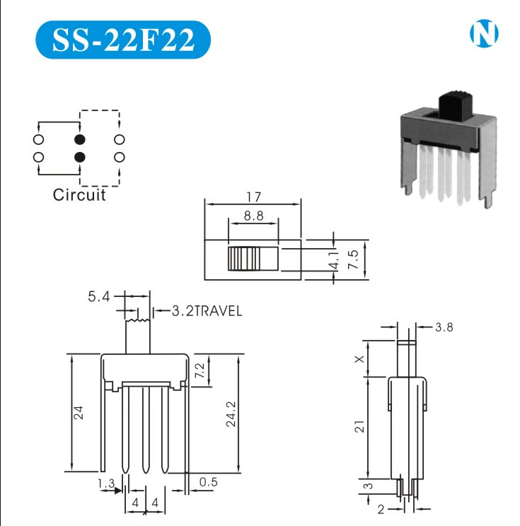 SS-22F22 詳細資料 產(chǎn)品說明: 技術(shù)指標: 使用溫度范圍 -20~+70℃ 耐壓 AC250V(50Hz)/min 額定負荷 DC 50V 0.5A 動作力 250±100gf 接觸電阻 ≤0.05Ω 機械壽命 10000次 絕緣電阻 ≥100MΩ