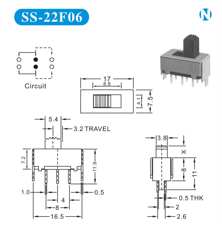 SS-22F06 詳細資料 產品說明: 技術指標: 使用溫度范圍 -20~+70℃ 耐壓 AC250V(50Hz)/min 額定負荷 DC 50V 0.5A 動作力 250±100gf 接觸電阻 ≤0.05Ω 機械壽命 10000次 絕緣電阻 ≥100MΩ