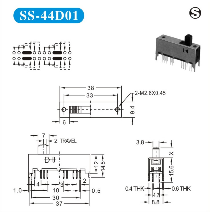 SS-44D01 詳細(xì)資料 產(chǎn)品說明: 技術(shù)指標(biāo): 使用溫度范圍 -20~+70℃ 耐壓 AC250V(50Hz)/min 額定負(fù)荷 DC 50V 0.5A 動(dòng)作力 250±100gf 接觸電阻 ≤0.05Ω 機(jī)械壽命 10000次 絕緣電阻 ≥100MΩ